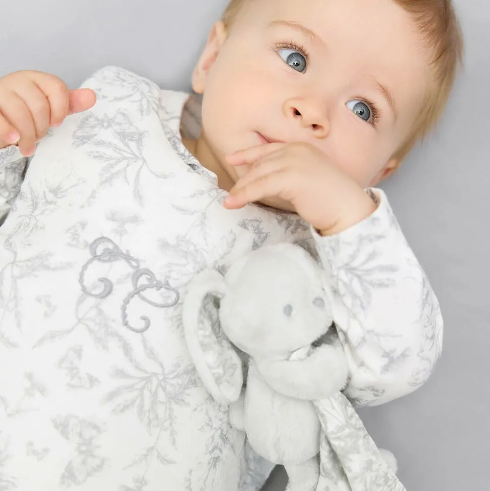 A grey comforter for baby boys and girls by French brand Tartine et Chocolat, sweet for your little one to snuggle. The Augustin the Rabbit bunny toy is made from velvety soft plush with ears and feet decorated in a toile de Jouy design. A charming accessory for the nursery, it holds a matching breathable blanket delicately signed with a signature logo embroidery.