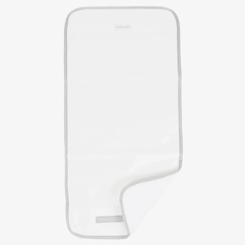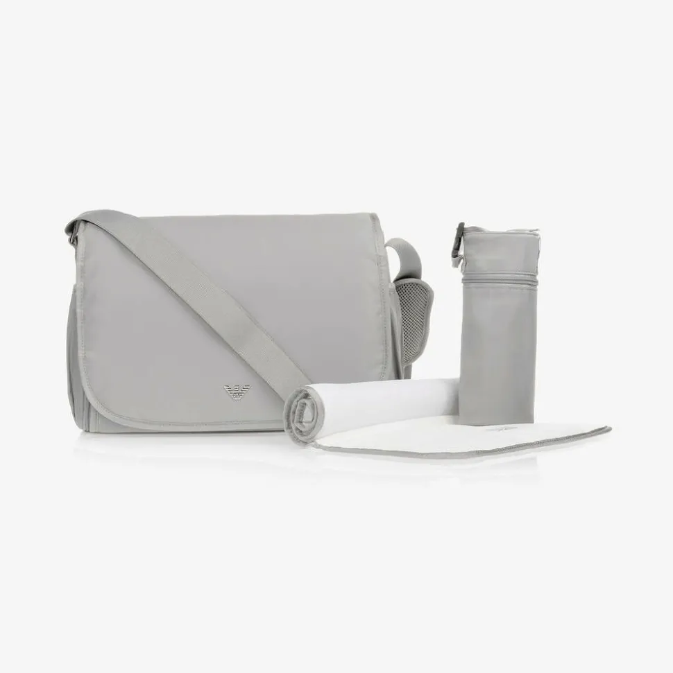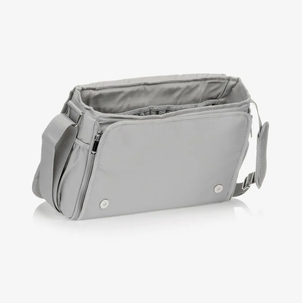 Practical and smart silver grey Emporio Armani changing bag, with a silver-tone Eagle logo plate. Smooth with branded trims, the main compartment has multiple pockets for easy organisation and magnetic popper closure on the flap. It has an adjustable shoulder strap and fixed stroller straps which can be neatly tucked away when not in use. It comes with a foldable changing mat and an insulated bottle bag.