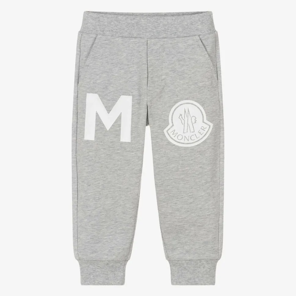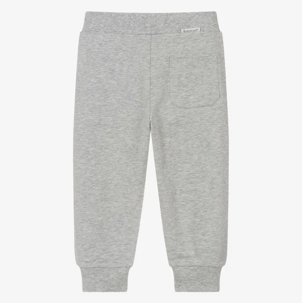 Grey joggers for baby boys by luxury French brand Moncler Enfant, made in soft and stretchy sweatshirt jersey. They have front and back pockets, with white logo prints on each leg.