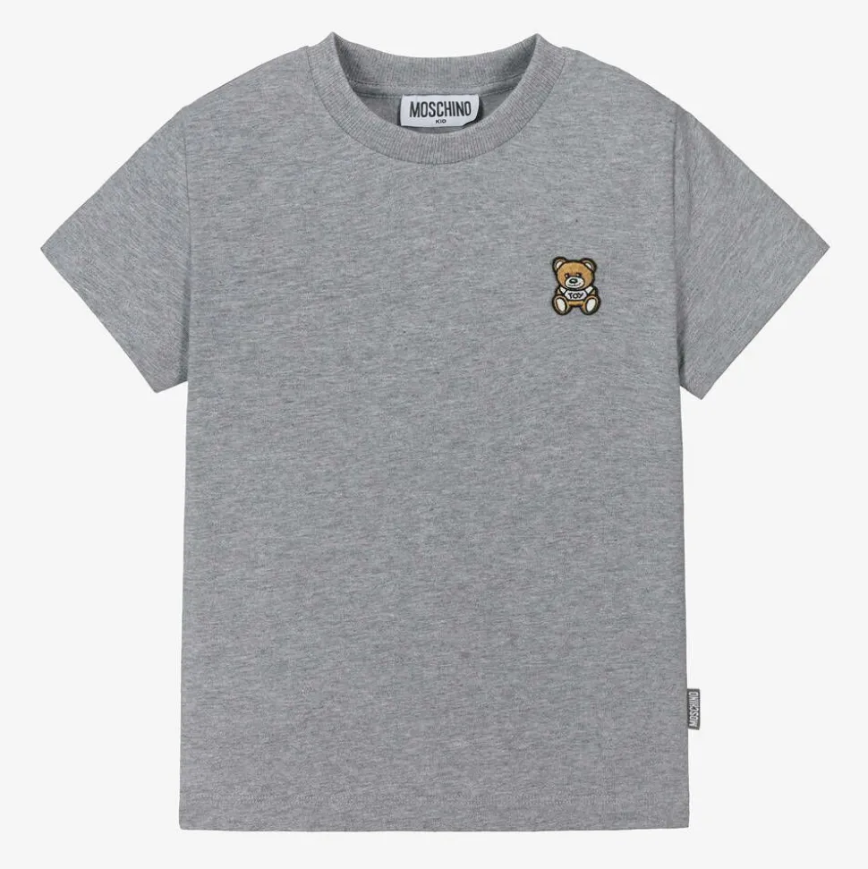 Grey marl crew neck T-shirt for boys and girls by Moschino Kid-Teen, with the Italian designer's embroidered Teddy Bear patch on the chest. Made in soft cotton jersey, this casual wardrobe staple has short sleeves and a branded tab on the side seam to complete the look.