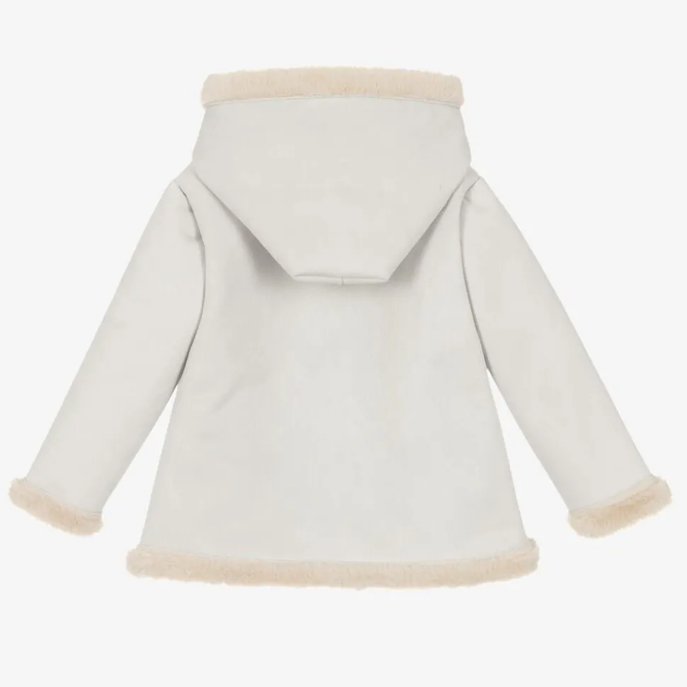 Lovely light grey coat for boys and girls by Spanish brand, Mebi. Made in smooth faux suede, this hooded coat fastens with wooden-style buttons on the front. It is lined in luxuriously soft plush faux fur for a super warm and cosy fit.