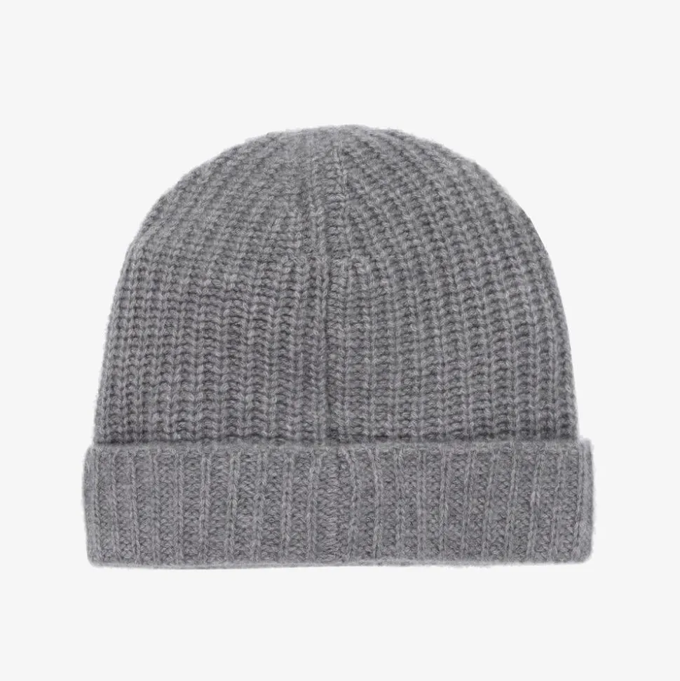 A grey beanie hat for boys and girls by luxury designer, Il Gufo. With a turn-up brim, this minimalist design is knitted in soft, pure cashmere for superior warmth.