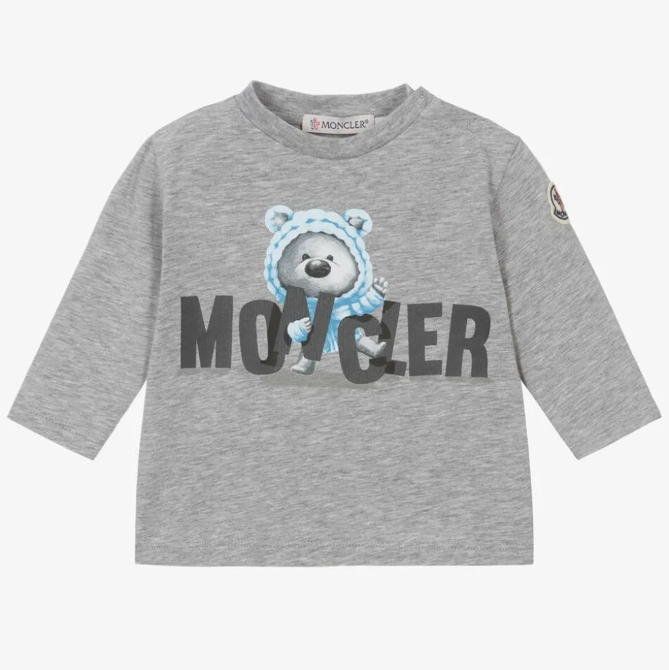 Grey marl top for little boys and girls by luxury brand Moncler Enfant, made from soft and stretchy cotton jersey. Symbolic of the brand, this signature piece has a bold logo print on the front, along with a friendly bear motif. The iconic felt logo patch can be seen on one sleeve for added identity. All sizes have popper fastenings on one shoulder to help with over-the-head dressing.