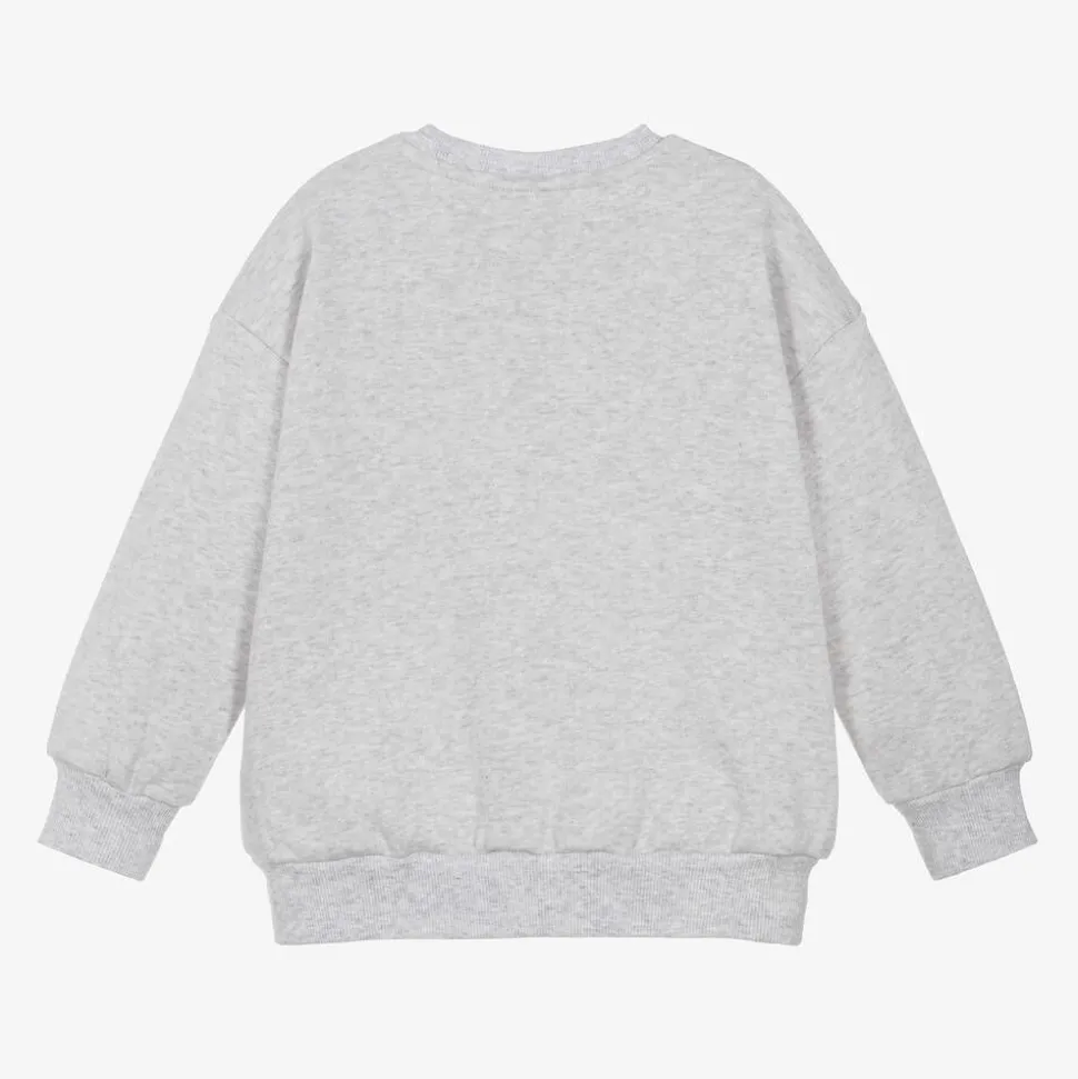 Grey marl sweatshirt for boys and girls by Mini Rodini, made in mid-weight organic cotton jersey. It has a crew neck, dropped shoulder seams and ribbing around the hem for a cosy fit. A fleecy feel on the inside makes layering even more comfortable. A smiling brown dog is embroidered on the chest for a fun finish.