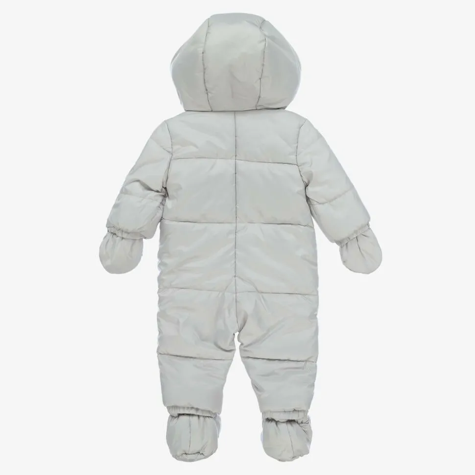 Adorable grey quilted snowsuit for baby boys and girls from Spanish brand, Mayoral. Silky smooth and warmly padded, it has a soft and comfortable cotton jersey lining and a useful double front zip fastening. For added protection, the neck opening secures with a popper, the cuffs are elasticated, and smaller sizes come with detachable mittens and booties. To complete the cute look, there is an appliqué teddy bear face on the front in soft beige teddy fleece, with a matching ivory trim on the hood.