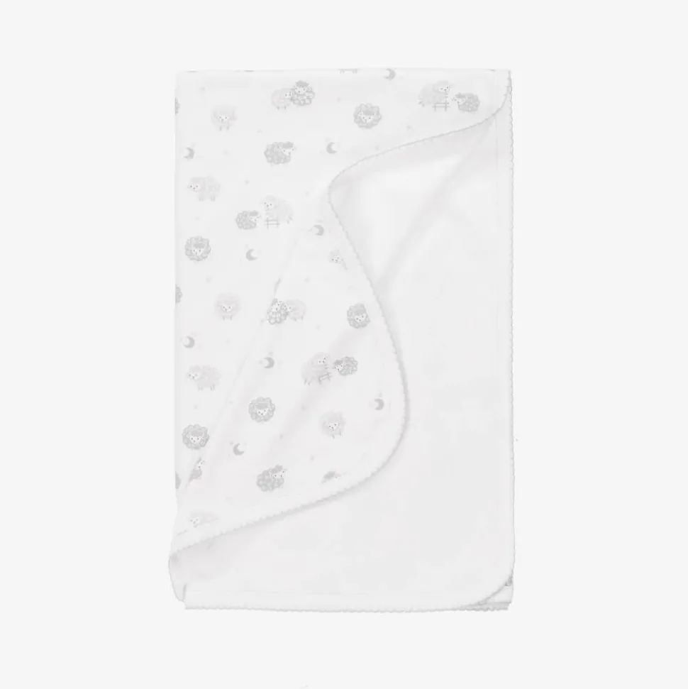 White blanket for baby boys and girls by Kissy Kissy, made in a double layer of soft, stretchy Pima cotton jersey. One side has a cute grey sheep pattern with grey picot trims. The reverse is plain white. This lovely accessory is ideal for use in the nursery or when out and about in the pram or car seat.