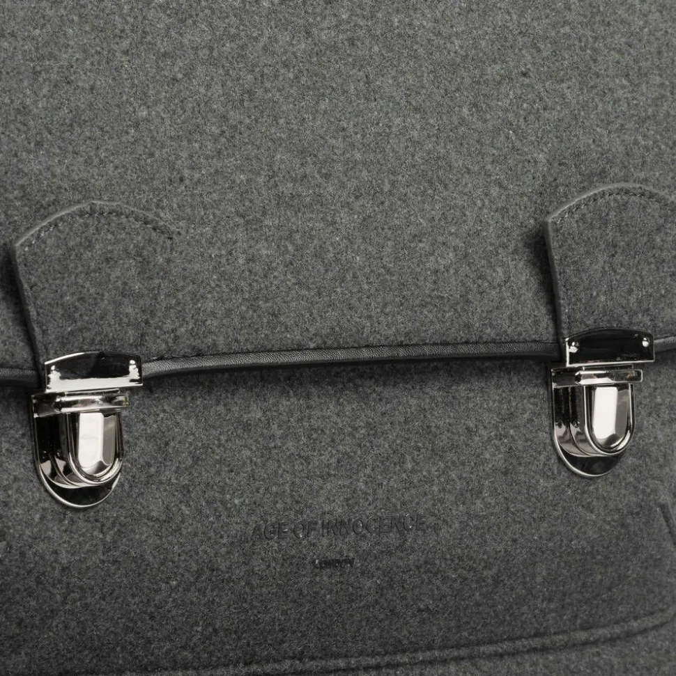 Smart grey satchel backpack for boys and girls by British brand Age of Innocence. This sturdy and structured bag is beautifully handcrafted in soft felted wool with black faux leather trims and shiny silver-tone hardware. Ideal to use as a school bag, it has a roomy main compartment with a silky lining, an inner zipped pocket, an ID window and a large slip pocket on the front. The flap fastens with two press clasps for a classic look. It can be carried at the top handle or worn on the shoulder with the adjustable straps.