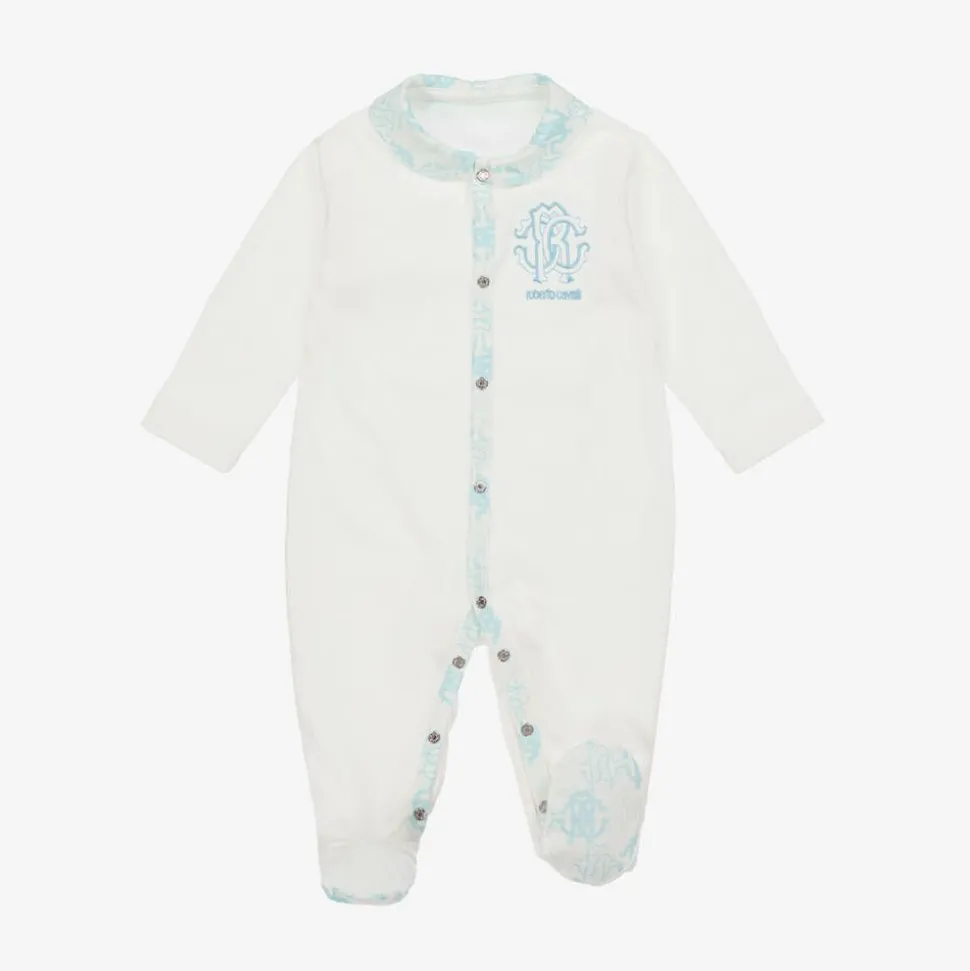 Beautifully presented in a branded box, this ivory babysuit set for boys by luxury Italian designer Roberto Cavalli, is made in the softest cotton jersey. Making a lovely gift for a new arrival, the babygrow is trimmed with the iconic RC Monogram in blue, with logo embroidery on the chest and embossed gold-tone popper fastenings on the front. To complete the sweet outfit, it comes with a matching hat with a cute turn-up brim and a useful popper-fastening bib that is ideal for catching little spills.