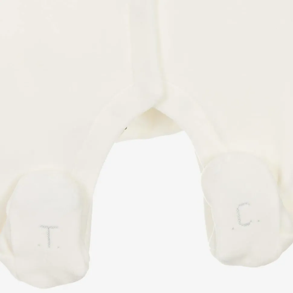 Ivory babygrow for boys and girls by Tartine et Chocolat, made in cosy cotton-blend velour with a traditional rounded collar. Adorable bunnies and alphabet lettering can be seen embroidered on the front for a cute look. There are popper fastenings on the front and between the legs for easy dressing.