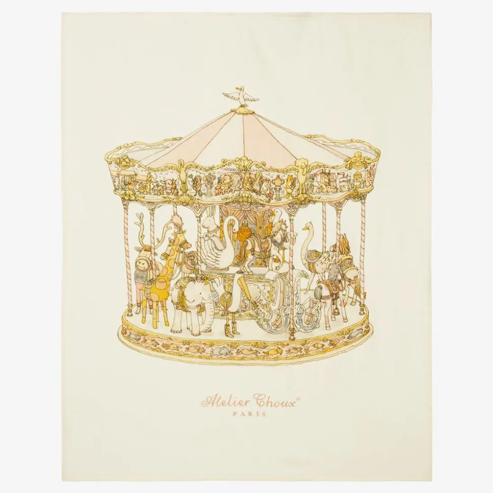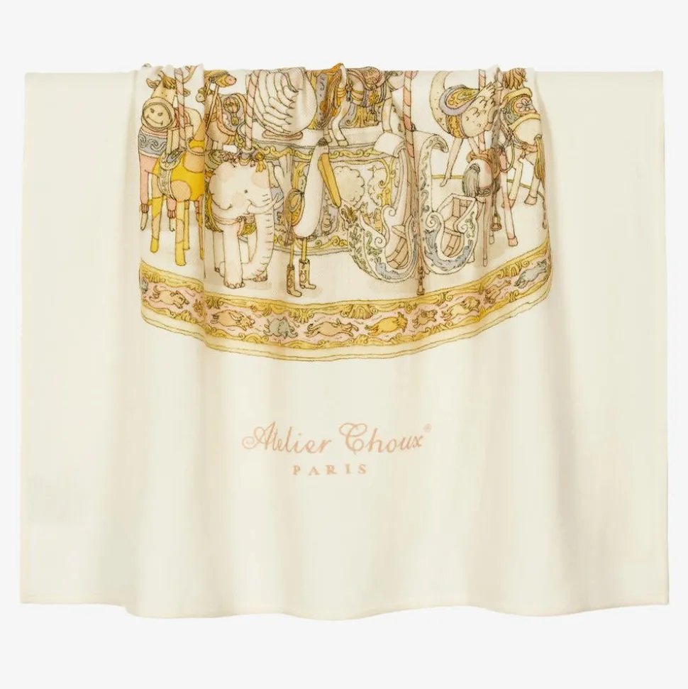 Beautiful ivory blanket for baby girls by Atelier Choux Paris, knitted in a luxurious cashmere and wool blend. Super soft and lightweight, it has a sweet animal carousel on the front with the signature brand name below. Gentle on the skin, this versatile nursery accessory can be used all year round as a cosy cot cover for baby, or when out and about in the car seat and stroller. It is presented in a gift box and can be kept as a lovely keepsake.