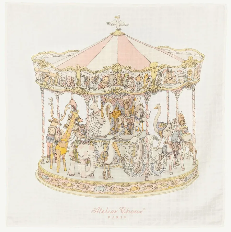A charming, ivory babysuit set for girls by Atelier Choux Paris. Made in soft organic cotton, the swaddle blanket is illustrated beautifully with a large animal carousel in the middle. Luxurious and versatile, it can be used for swaddling or for added privacy while breastfeeding. The matching, double-sided bib has an adjustable popper fastening for an ideal fit. The soft, cotton babygrow has an all-over dessert-themed print with a smart, gold thread trim and useful gold popper fastenings. All three pieces are presented in a lovely gift box.