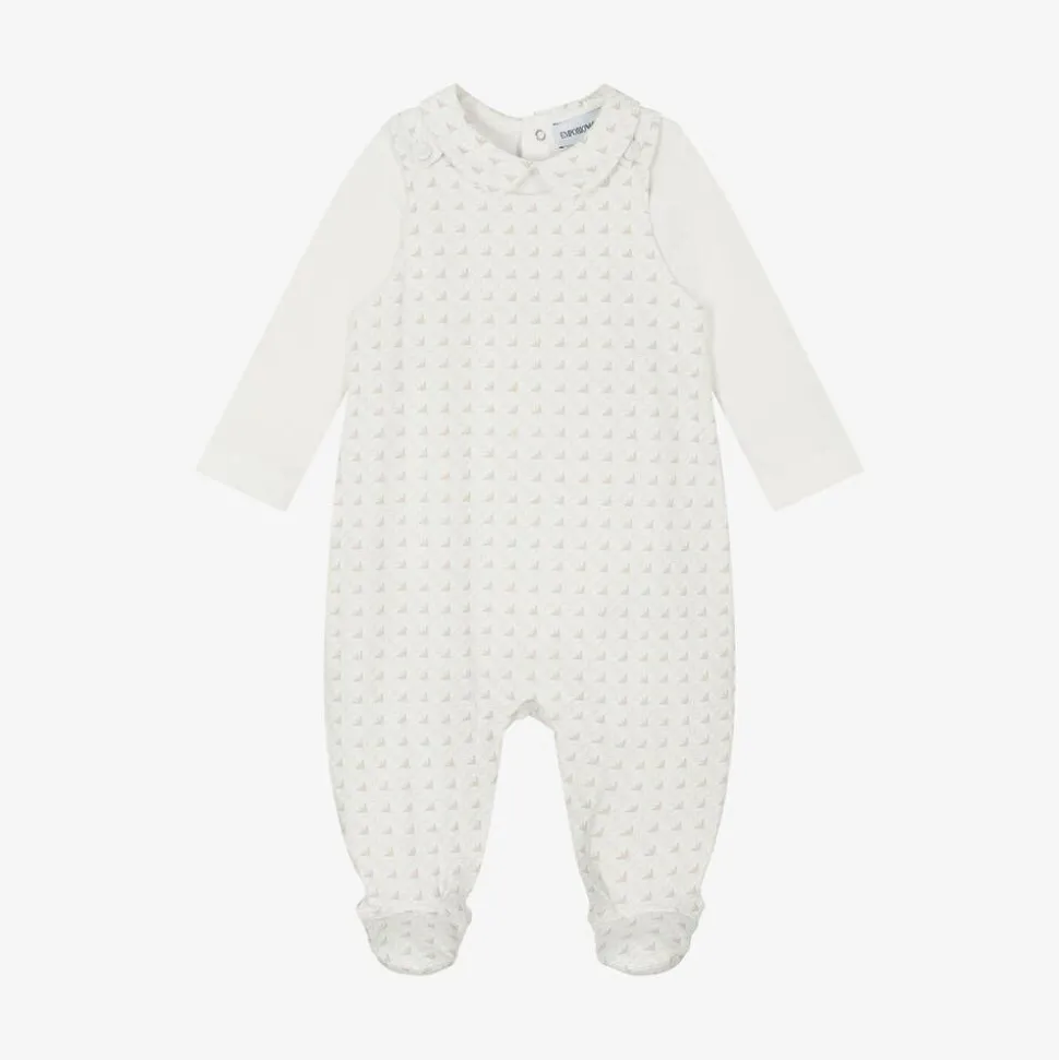 A lovely ivory babysuit set for boys and girls by Emporio Armani, made from soft cotton jersey. The dungaree-style babygrow is printed with a beige Eagle logo pattern and fastens with covered buttons on the shoulders. The bodysuit has a sweet Peter Pan collar that matches with the babygrow for a coordinating look. Both pieces have popper fastenings between the legs to make dressing easier.