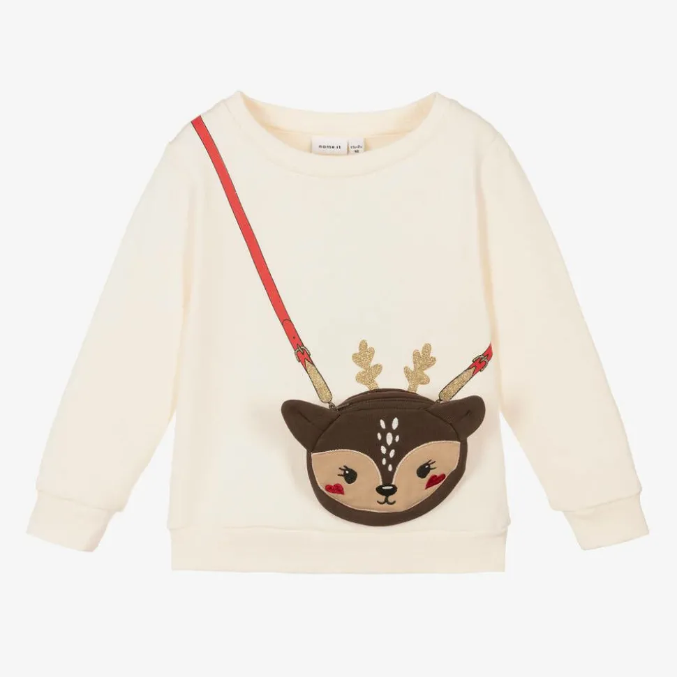 Ivory long-sleeved sweatshirt for girls by Danish brand Name It. The front features a cute reindeer shoulder bag design, with a zipped opening, printed red straps and glittery gold detailing. Made in soft organic cotton jersey, this festive top has a cosy fleecy inside and stretchy ribbed trims.