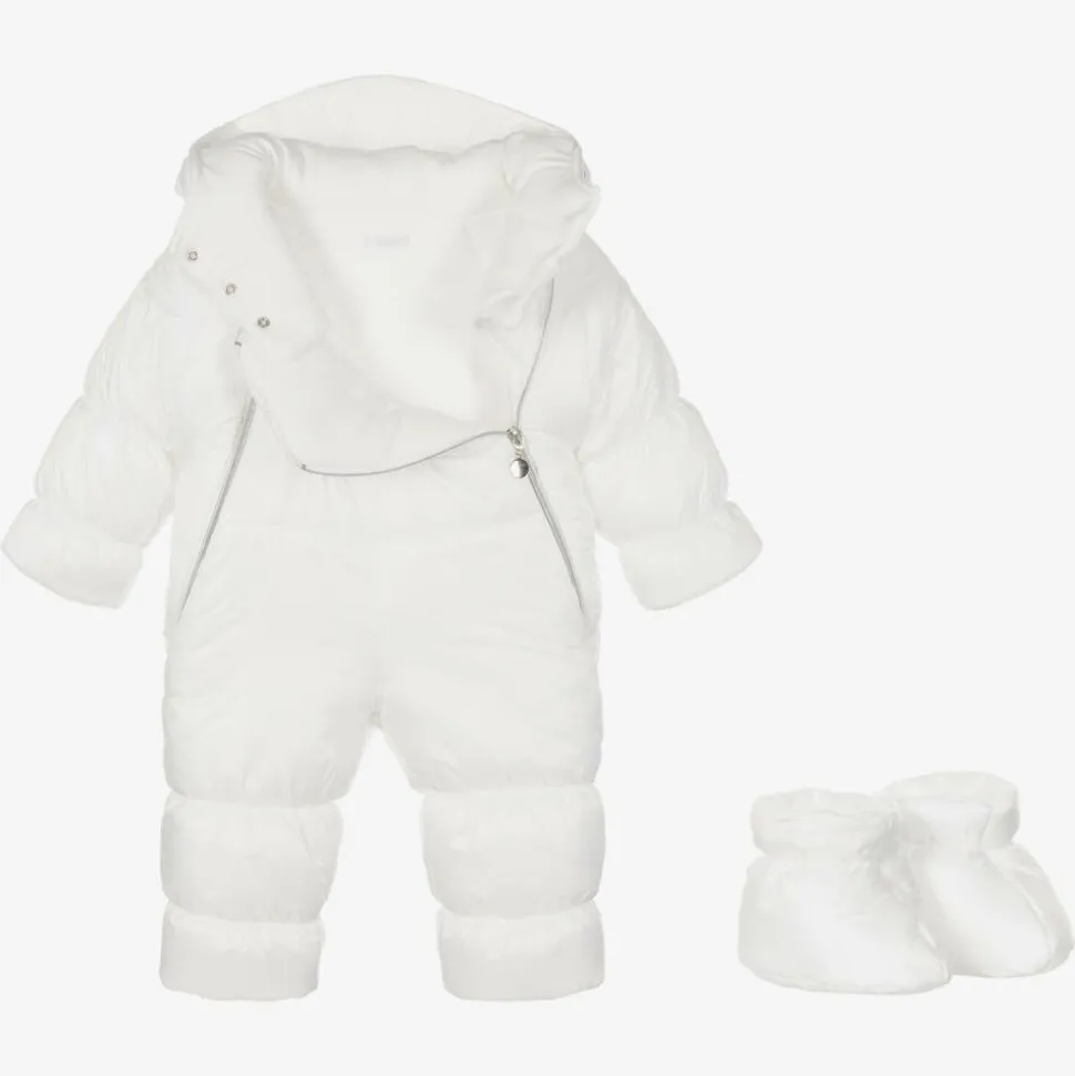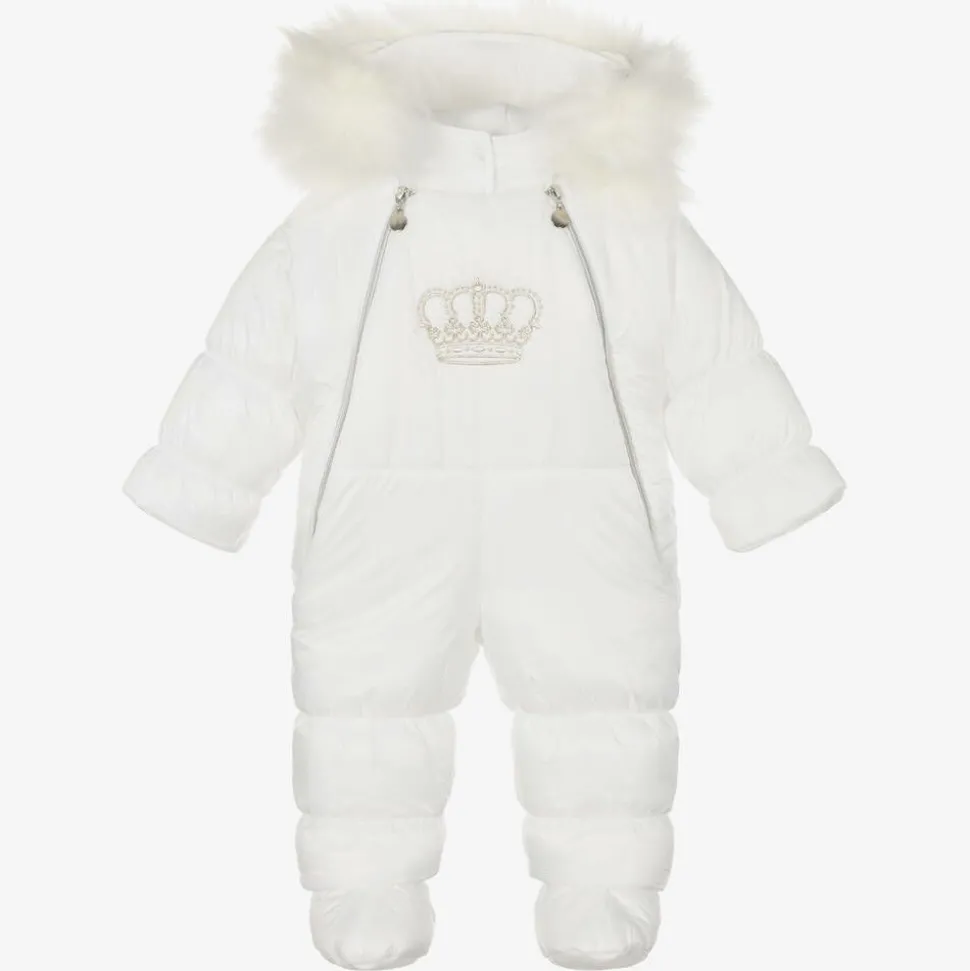 Exclusive to Childrensalon, a silky ivory snowsuit for baby boys and girls by Polish brand Sofija, with a shiny silver crown embroidered on the front. Warmly padded with a cosy, faux fur-trimmed hood, it is lined in soft, comfortable cotton jersey. The snowsuit has a double front zip closure, a popper-fastening internal panel, cuff inserts and detachable booties for extra cosiness.