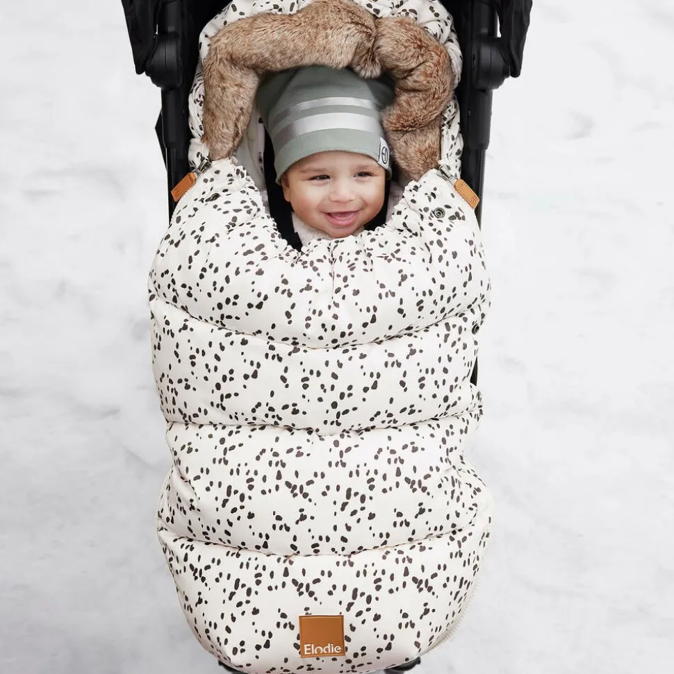 Lovely ivory footmuff for baby boys and girls by Swedish brand Elodie, patterned with a spotted Dalmatian print. Padded for warmth and lined in cosy polar fleece, this stroller accessory has holes on the back to thread a harness through. It fastens with a smooth zip along the side and the bottom to help easily get baby in and out. The detachable faux fur trim adds a luxurious touch.
