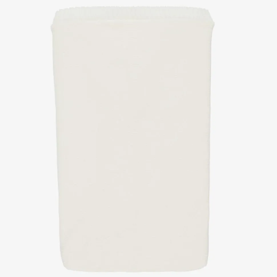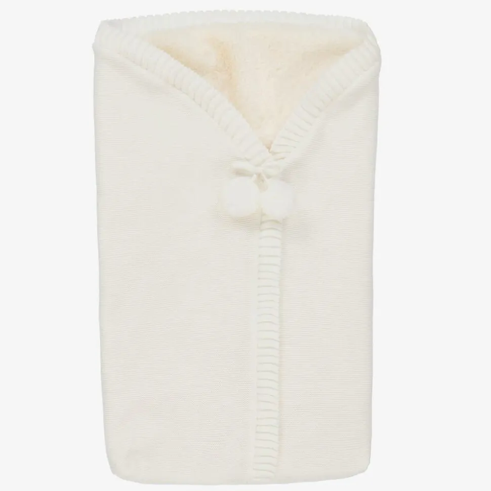 Ivory knitted baby nest for boys and girls by Spanish brand Mebi. It is lined in super soft and snuggly plush faux fur to keep your little one cosy and has a concealed front zip fastening. There are ribbed trims and decorative pom-poms on the front.