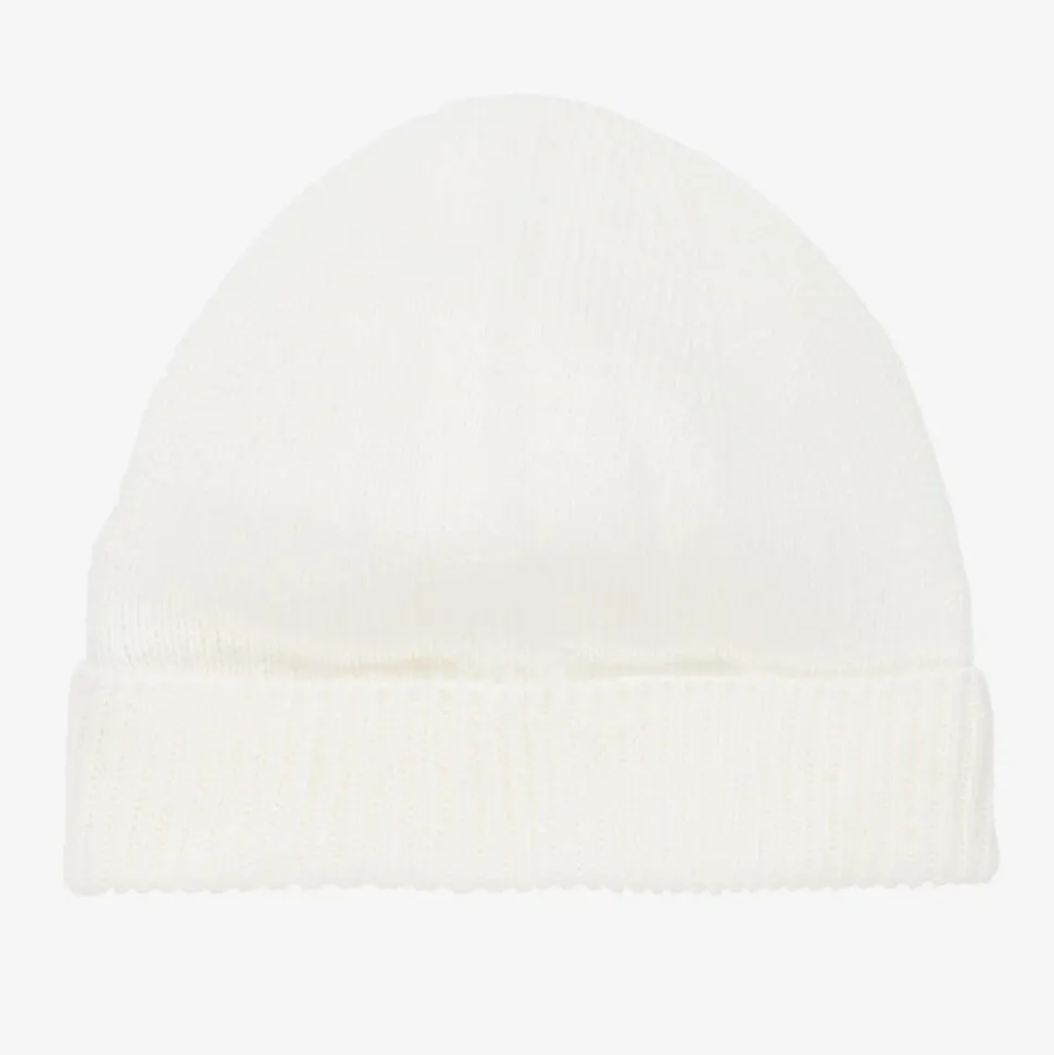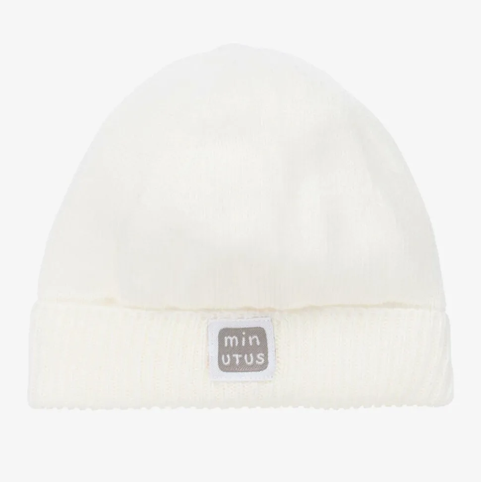 Adorable ivory hat for baby boys and girls by Spanish designer, Minutus. Made in soft, stretchy knitted cotton, it has a logo patch on the back of the turned-up brim and is lovely for keeping little heads warm.