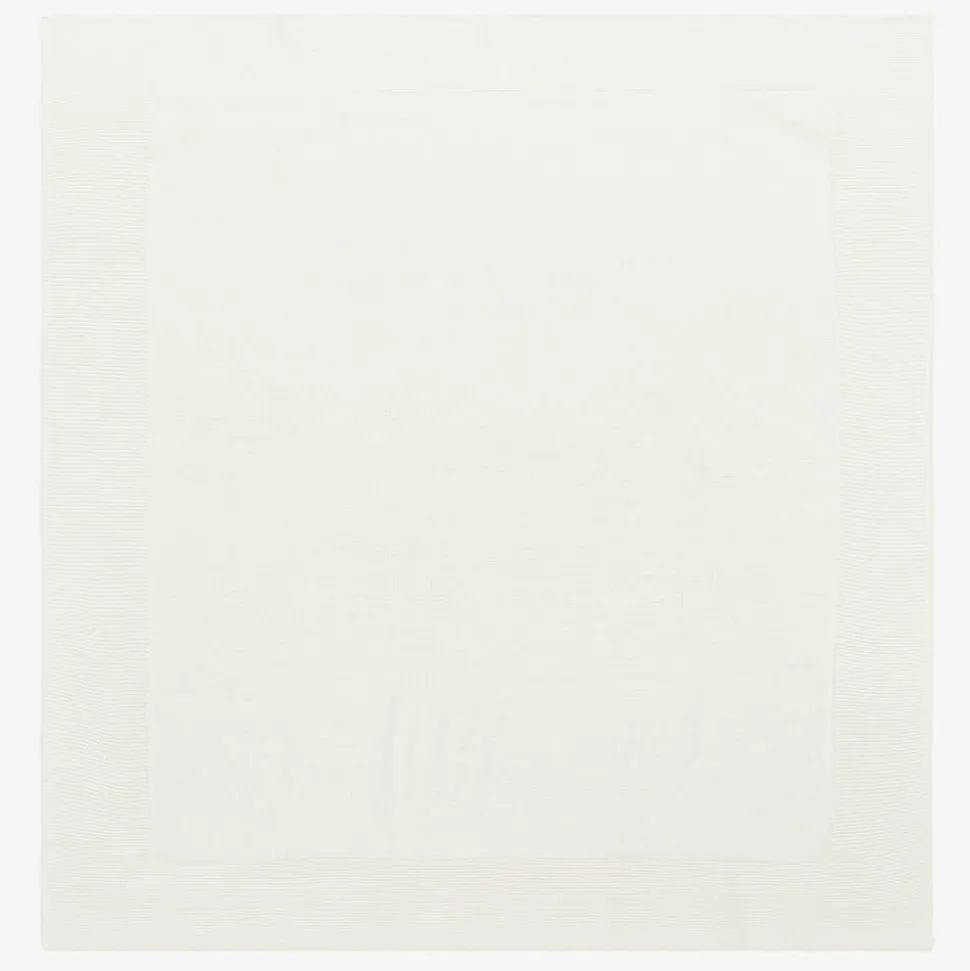 Ivory blanket for baby boys and girls by Spanish brand Mebi. In a soft knit, it has a pretty floral-embroidered lace trim on the front. Ideal for use in the car seat or stroller, this lovely blanket also makes an attractive nursery accessory.