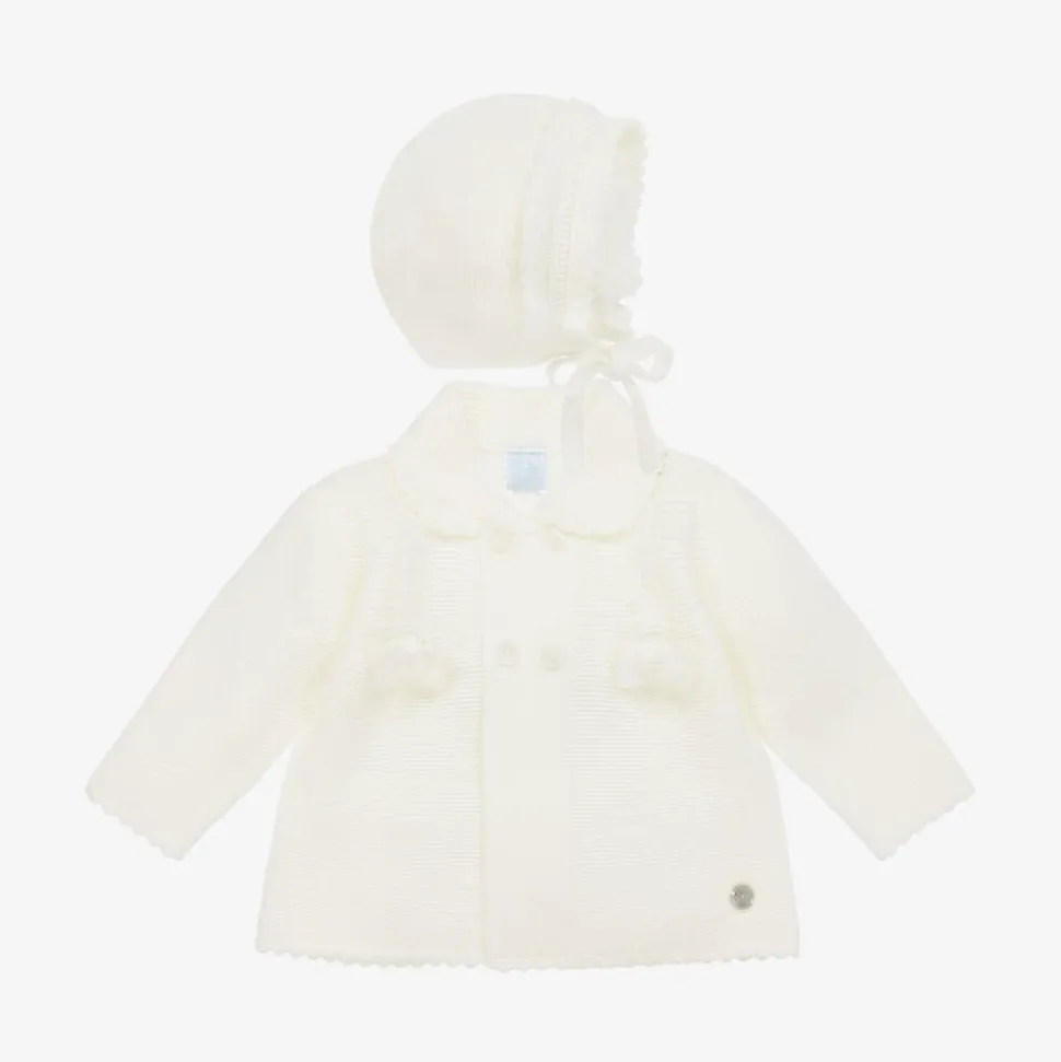 Knitted ivory pram coat and hat set for baby girls by Artesanía Granlei, great for adding a layer of cosiness when out and about. Traditionally styled, it has a rounded collar, pointelle trims and cute bows appliquéd on the chest. It fastens with double-breasted buttons on the front a classic look, and is accessorised with a frilly tie-fastening bonnet.