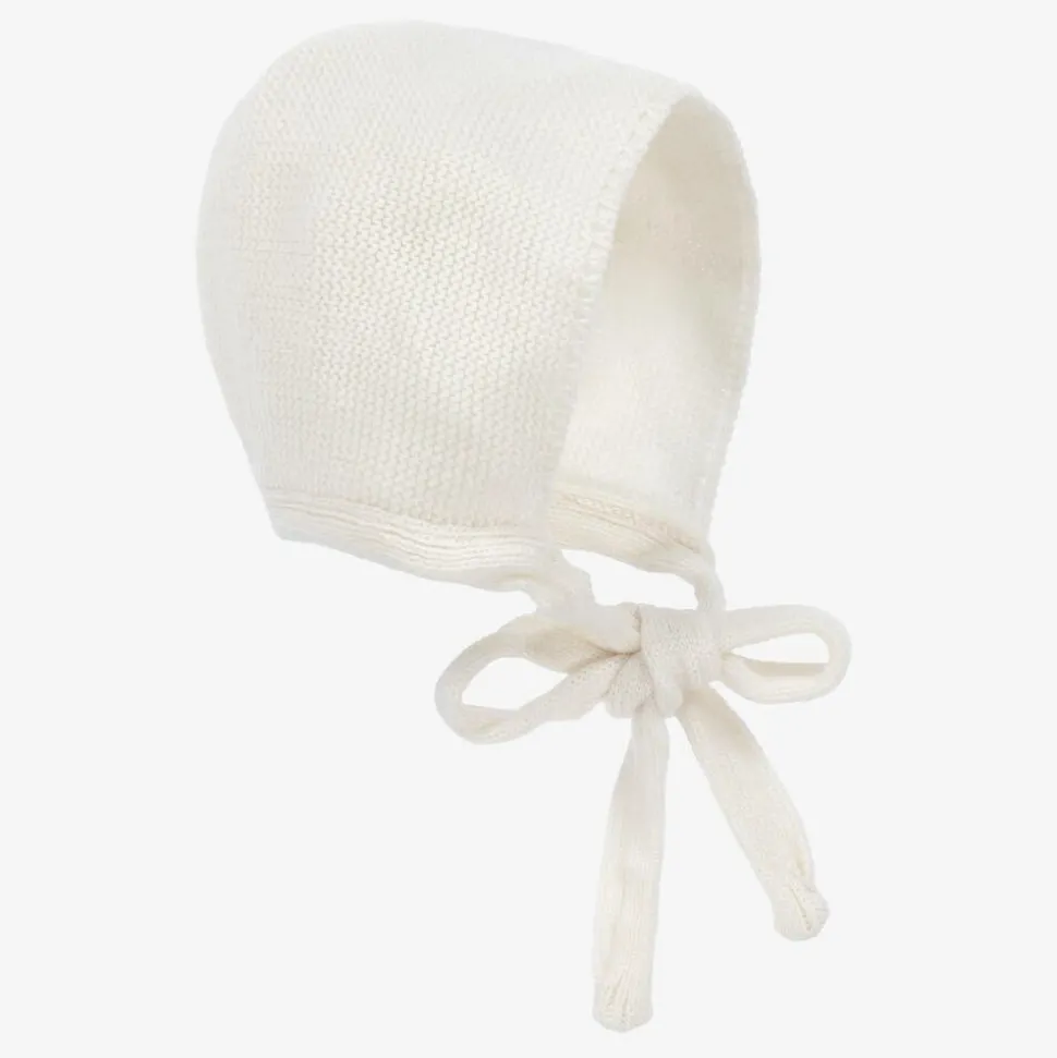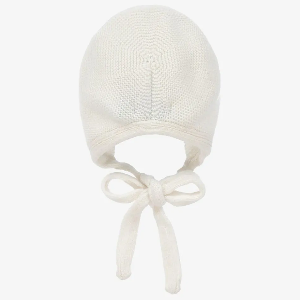 Lovely ivory knitted bonnet for baby boys and girls, by Foque. Knitted in a beautifully soft wool and cashmere blend, it fastens with a tie underneath the chin for a secure fit.