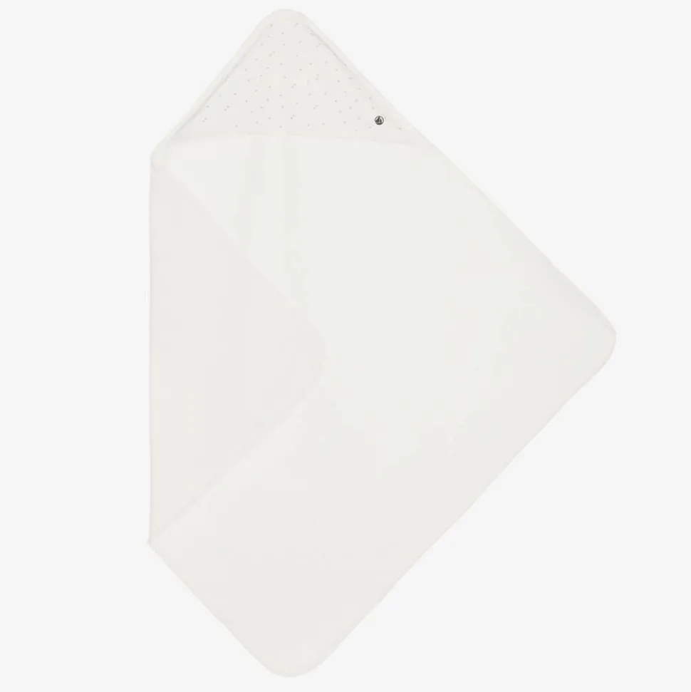 A sweet ivory hooded towel for baby boys and girls from French brand Petit Bateau. Made in soft and absorbent organic cotton blend towelling, it is comfortable against delicate skin and lovely for keeping your little one dry and cosy after bath time. The sides and hood are trimmed in soft cotton jersey with a tiny grey star pattern and a logo on the hood.