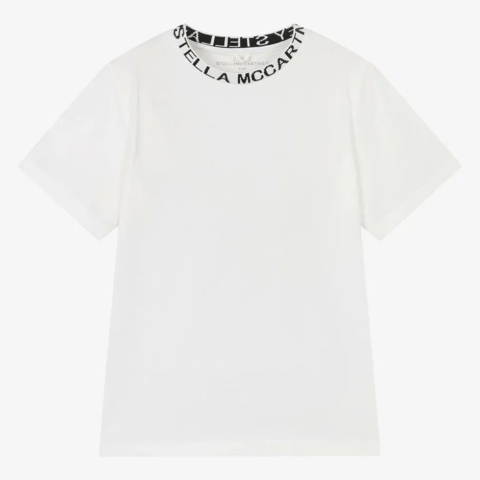An ivory T-shirt for boys and girls by Stella McCartney Kids, comfortable and soft in organic cotton jersey. A great choice for layering, this short-sleeved T-shirt has a ribbed, jacquard logo tape neckline in black and white. The Stella McCartney fit can be quite small so choose a size up if you want room to grow.