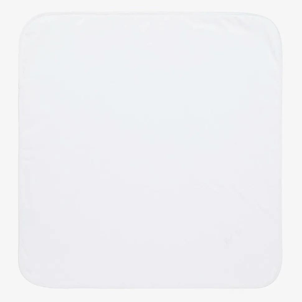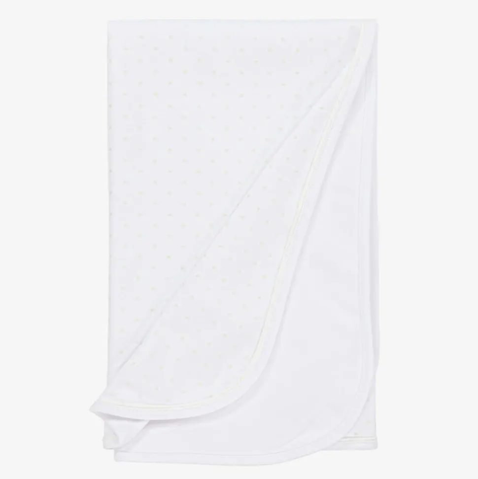 Baby boys and girls ivory and grey blanket by Magnolia Baby. Made in a beautifully soft, Pima cotton, it has the designer's 'Worth the Wait' embroidered stork and baby motif with tiny ivory spots. It is lined with soft ivory Pima cotton and is ideal for using in the cot or when out-and-about as a cover-up