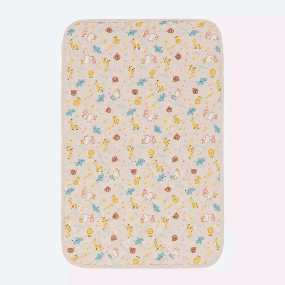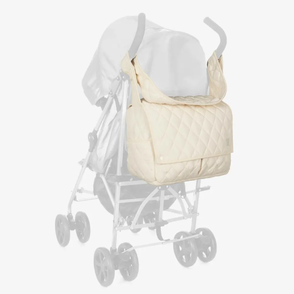 Ivory changing bag by Guess, made in soft quilted fabric. Ideal for storing all of baby's essentials, the spacious compartment fastens securely with a zip. There are useful external pockets concealed beneath a popper fastening flap and handy side pockets. The brand's logo appliqué can be seen on the front and it has an adjustable shoulder strap for comfortable wear. It comes with a lightly padded changing mat and drawstring bag, both of which are patterned with colourful logos and cute baby animals.