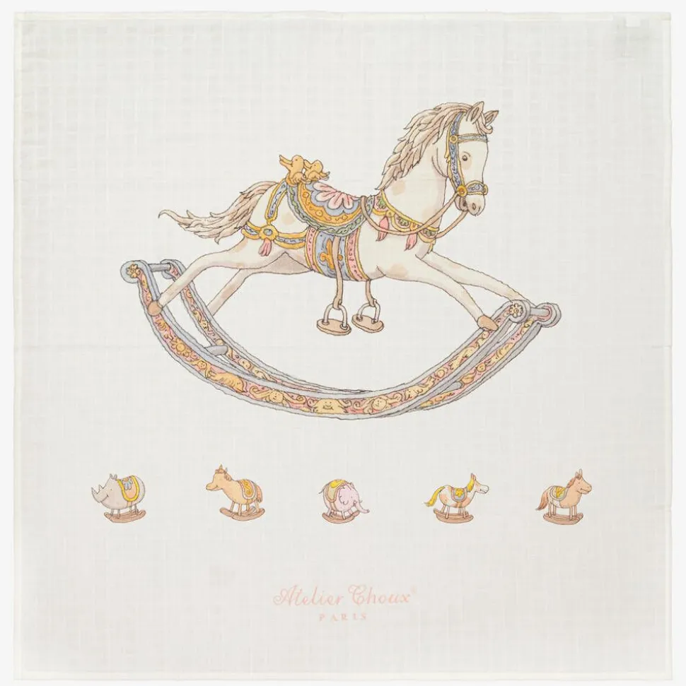 Luxurious ivory swaddle and bib set for baby boys and girls by French brand Atelier Choux, made in organic cotton. The comfortable and lightweight elegant swaddle has a beautifully illustrated rocking horse print on the front. The lovely cotton satin bib has a print on both sides and fastens with adjustable poppers. Ideal for gifting, this set is presented in a box with illustrations of animals and a Parisian townhouse.