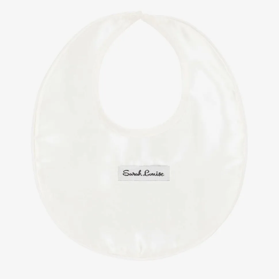 Sarah Louise ivory silk bib for baby boys and girls, with a delicate embroidery and a pearl button to fasten.