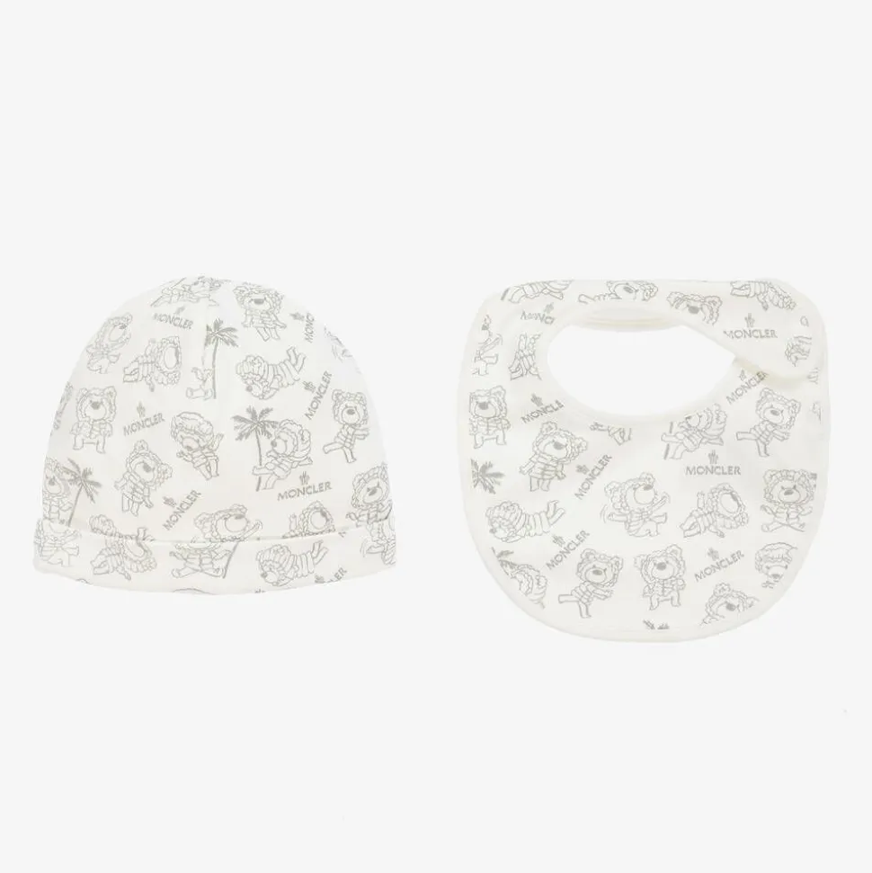 Cute ivory hat and bib set for baby boys and girls by luxury brand, Moncler Enfant. Made in beautifully soft cotton jersey, both pieces have a grey patterned logo print, featuring the label's Teddy Bear mascot, for sweet branded appeal. The hat is styled with a turn-up brim and the bib fastens easily with a popper on the neck.