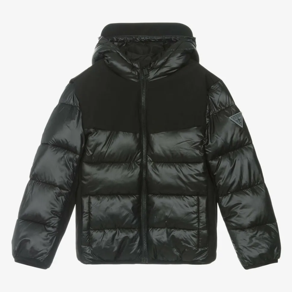 From Guess for Junior boys, a black puffer jacket padded for added warmth. This comfortable hooded jacket, is made from smooth silky material with matte panels for a subtle contrast and finished with a rubberised Triangle logo.