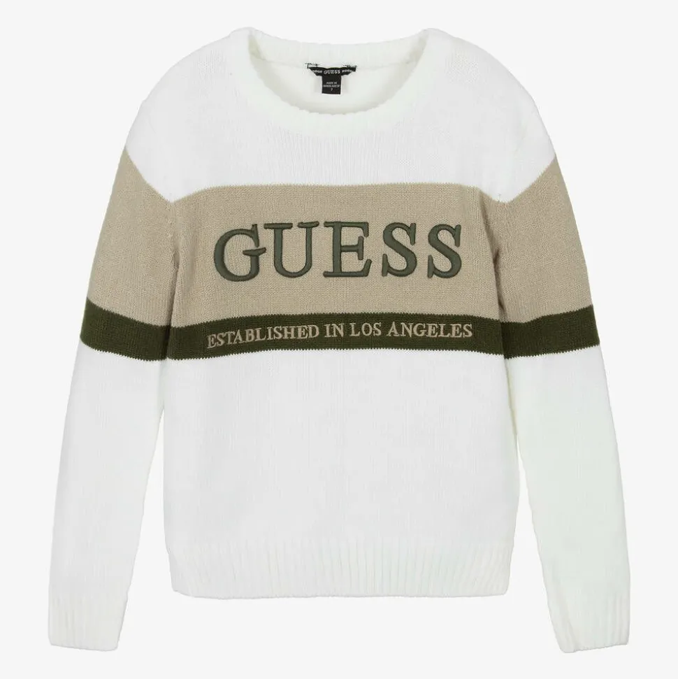 From Guess for junior boys, a white knitted jumper. Casually styled, this tight-knit jumper has ribbed trims on the neckline, cuffs and hem to keep warmth in whether worn separately or layered. The front has beige and green stripes across the chest onto the arms with the brand name and established location in contrasting colours.