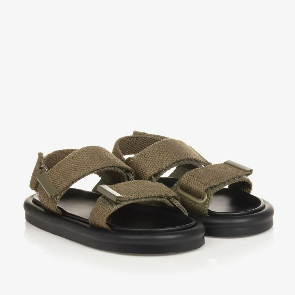 Khaki green canvas sandals for boys and girls handmade by British brand Age of Innocence. They are easy to wear, with velcro fastenings across the foot and around the back of the ankle, and endlessly comfortable too, with a moulded, smooth leather foot bed. The rubber soles are non-slip.