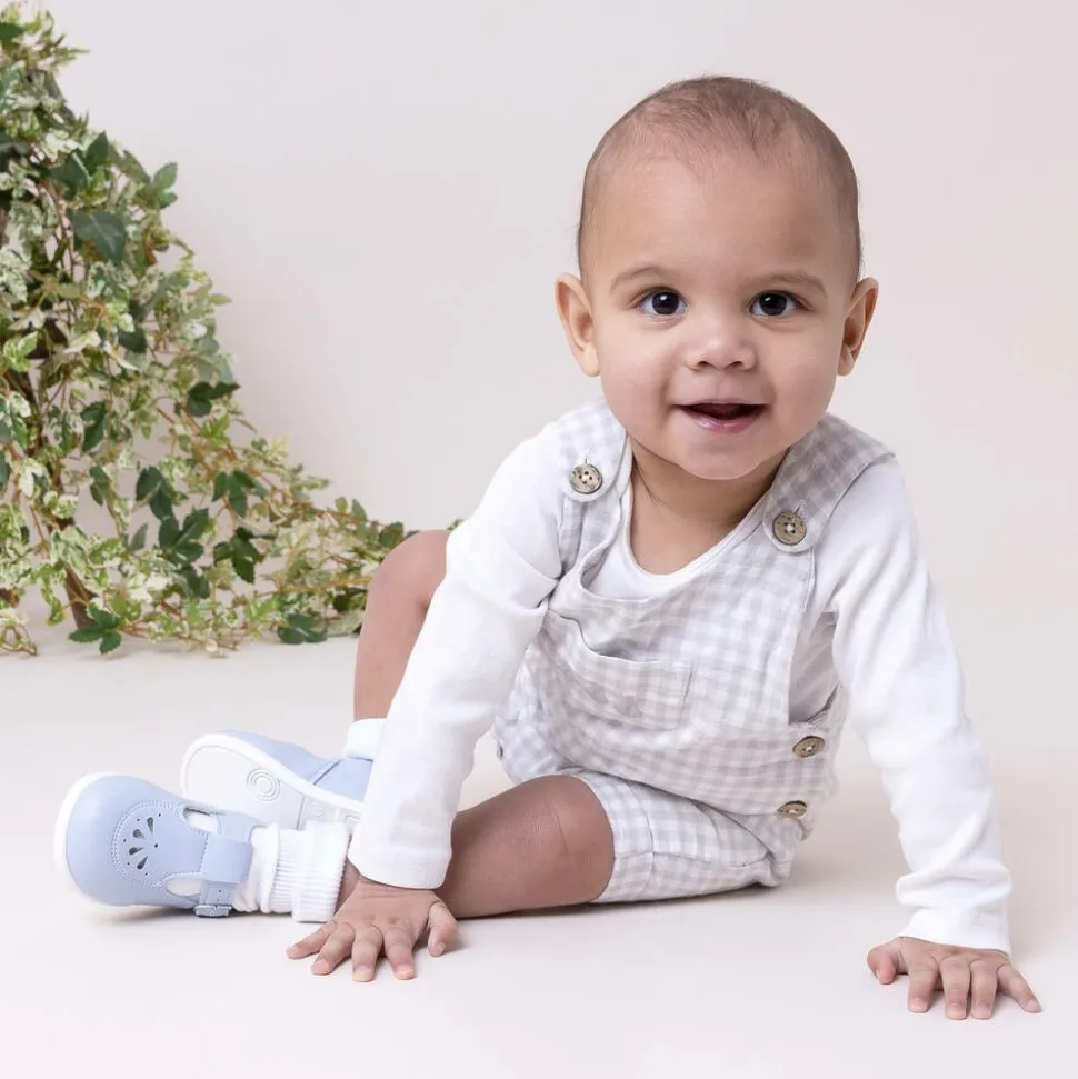 Pale blue first walker T-bar shoes for little boys and girls, by Early Days. Made in soft, faux leather, they have an adjustable silver buckle and a charming punched hole pattern on the toes. They are lined in white fabric, lightly cushioned and the non-slip outer soles are made of soft, flexible white rubber.