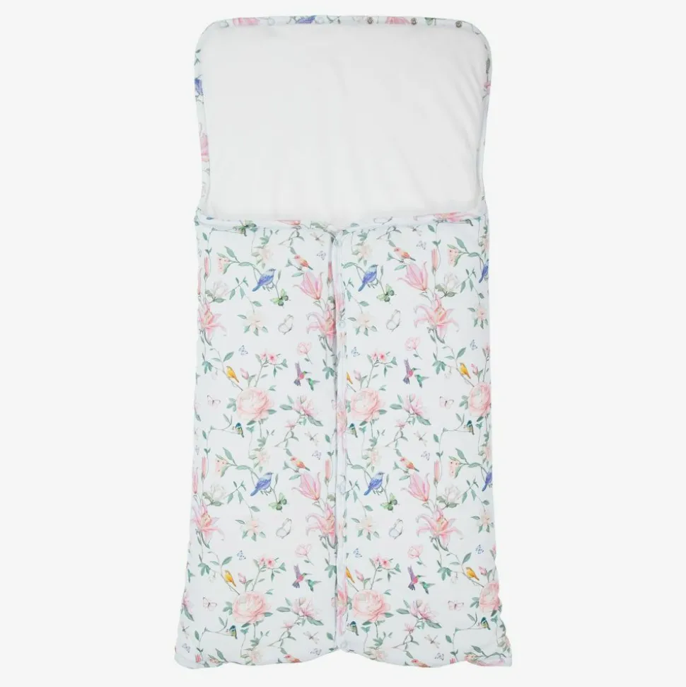 Exclusive to Childrensalon, a pale blue baby nest for girls by My Little Pie, made in super soft and stretchy organic Supima cotton jersey. Lightly padded, it has a pretty lily and bird print and popper fastenings on the front and bottom. There are poppers on the hood, which can be opened and laid flat.