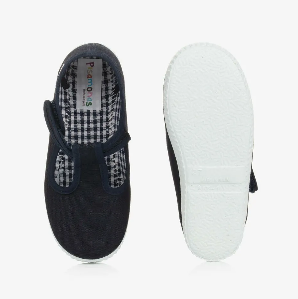 Navy blue T-bar shoes for little boys and girls by Pisamonas. Lined in soft gingham print canvas, these casual shoes have a rubberised outer sole for improved grip, and fasten simply with a velcro strap across the foot. The designer's colourful logo is stitched on the side of one foot, completing the style with subtle branding.