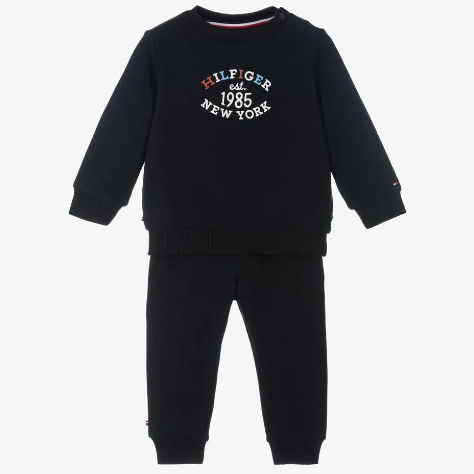 Navy blue cotton tracksuit for baby boys and girls by Tommy Hilfiger, made in soft jersey for comfortable wear. Casually styled with stretchy ribbed trims, the sweatshirt has a varsity-inspired logo design on the front and poppers on one shoulder to help with dressing. The joggers have side seam pockets, a back patch pocket and signature striped drawstring ties on the elasticated waistband. To complete the designer look, both pieces feature iconic flag embroidery. This product is made with at least 95% organic cotton.