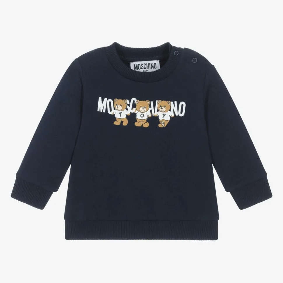 Navy blue sweatshirt for little boys and girls by Moschino Baby, made in cotton jersey with stretchy ribbed trims. Soft on the inside, this casual designer top has long sleeves and easy popper fastenings on one shoulder. White logo lettering stands out on the front, carried by three Moschino Teddy Bears.
