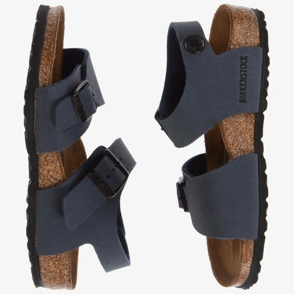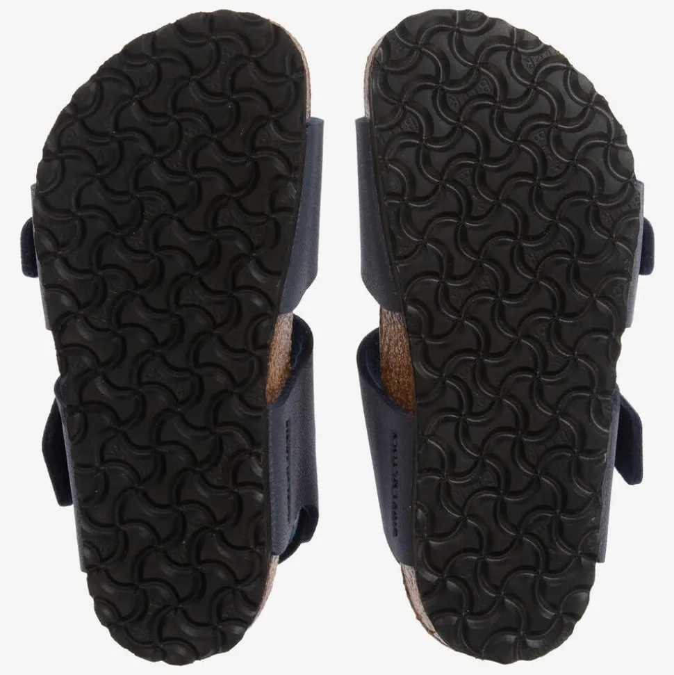 Navy blue Birkenstock sandals for boys and girls. The straps are made from soft and skin-friendly Birko-FlorĀ® faux leather with black buckle fastenings. The suede leather insole has an anatomically contoured footbed for promoting good walking posture, making them a great choice for growing feet. The black EVA rubber outsole improves grip.