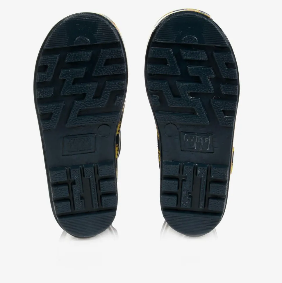 Boys navy blue rain boots by Playshoes, made from flexible rubber with a fire engine and flame print. They have an extra length of smooth fabric attached to the boots, with an adjustable toggle, great for keeping out the water when splashing in puddles. They are lined in soft textile with a comfortable padded inner sole. They have flexible grip soles and silver reflective patches, great for extra glow-in-the-dark safety.