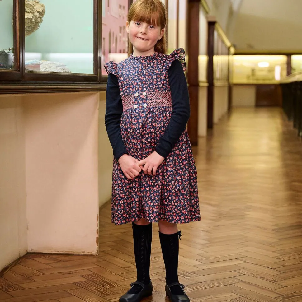 A navy blue, long-sleeved, ribbed thermal top for boys and girls by Joha, knitted in a beautifully soft and lightweight Merino wool. An ideal layering piece, it has been designed to absorb moisture and naturally regulate body temperature. It has a rounded neckline, lightly ribbed trims and a curved hem which is longer at the back. A striped rainbow logo tab features on one side seam.