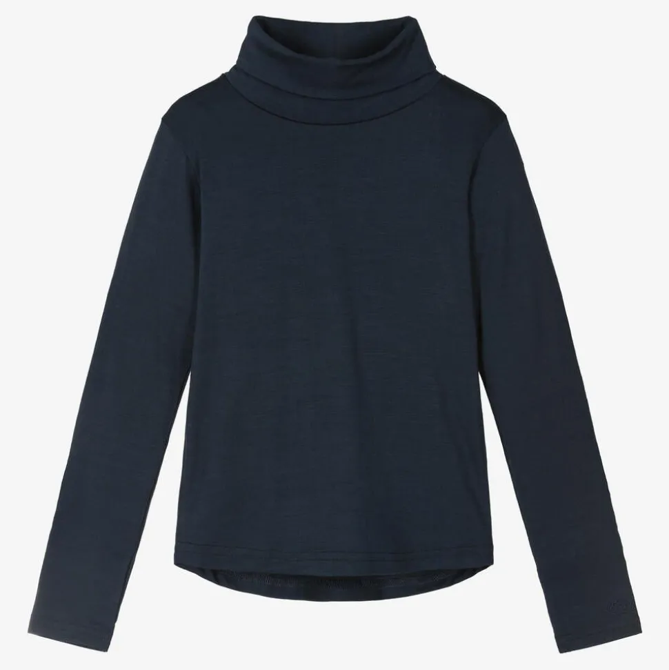 Navy blue roll neck top for boys and girls by London-based brand Smalls Merino. Beautifully soft, this technical design is finely knitted in sustainable ZQ Merino wool, helping to regulate body temperature and wick moisture away from the skin. Hypoallergenic and gentle against sensitive skin, this versatile piece can also be worn as a warm base layer or as comfortable loungewear. Longer in the body, it has a curved hem, long sleeves and a tonal logo embroidered on the cuff.