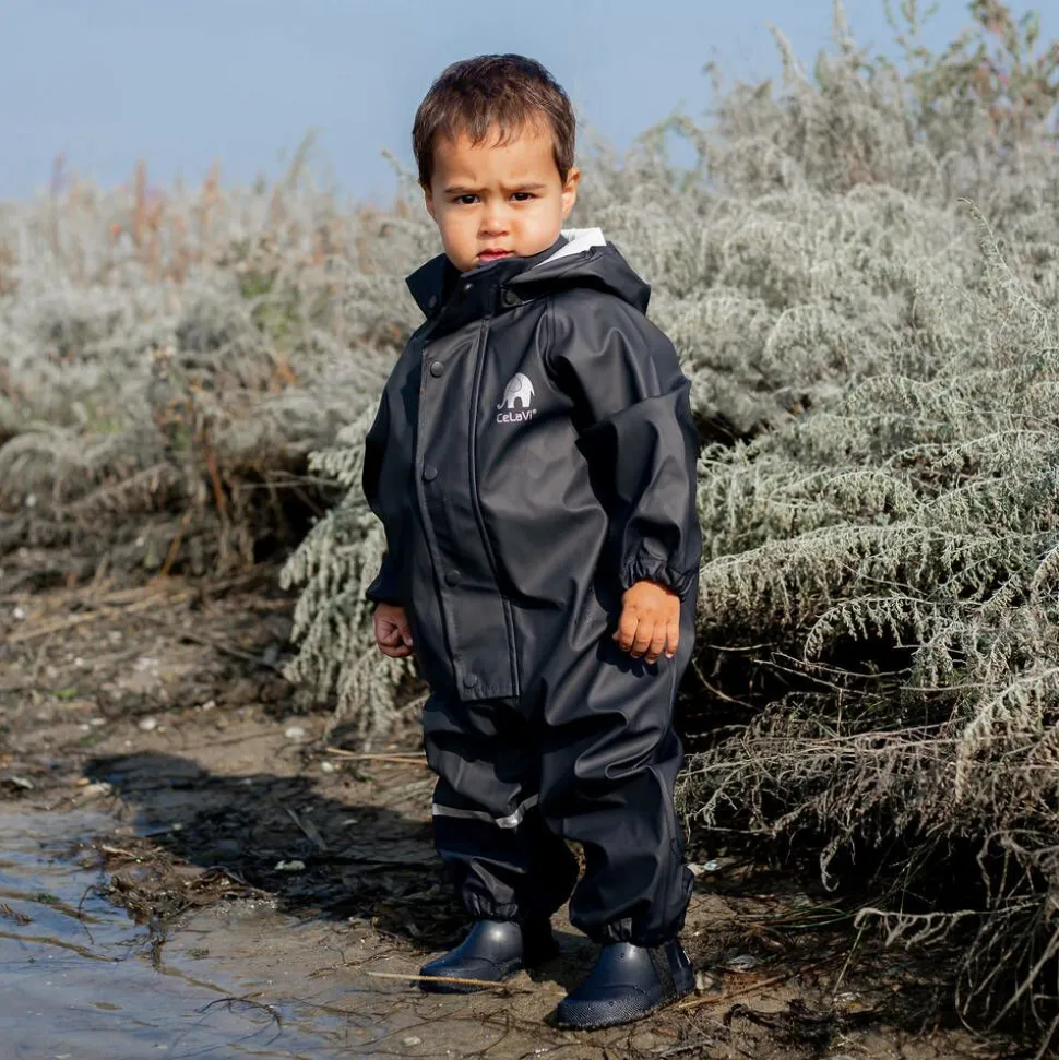 A practical, navy blue waterproof rainsuit for boys and girls from CeLaVi. It is made in smooth coated fabric, with reflective silver logo and stripe print on one leg. It has a detachable hood, fleece lining on the collar with a storm flap over the front zip. The hood and cuffs are elasticated, and there are adjustable elastic straps around the foot for a secure hold.