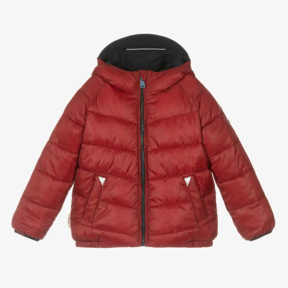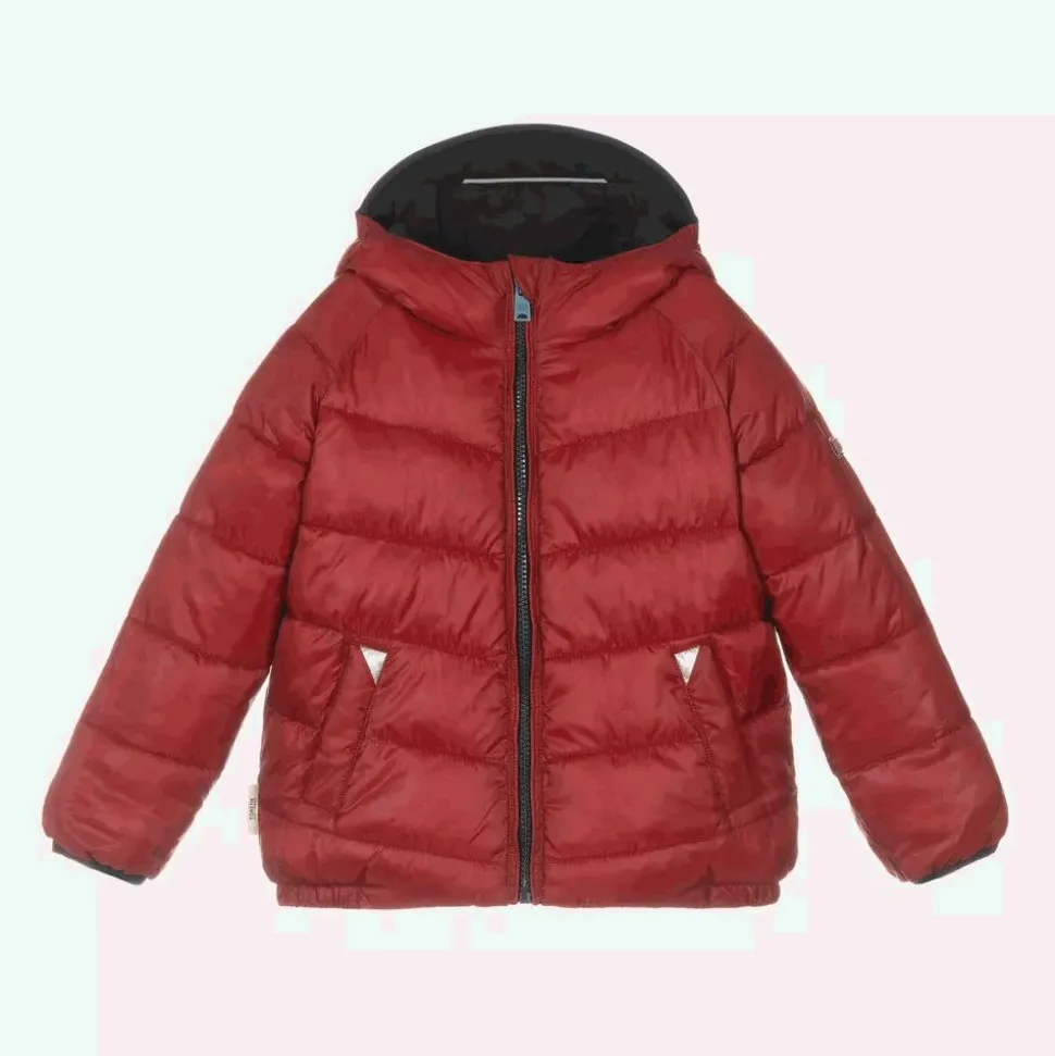 A reversible, hooded puffer jacket for boys and girls by British brand Töastie, matt navy blue on one side and silky red on the other. This water-repellent outerwear piece is lightweight yet provides superior warmth with mid-weight insulation. The hood has a short peak and is gently elasticated on the sides for added protection from the weather. Both sides feature fleece-lined pockets with popper fastenings, reflective detailing for improved visibility, logo tabs on one sleeve and branded elasticated cuffs.