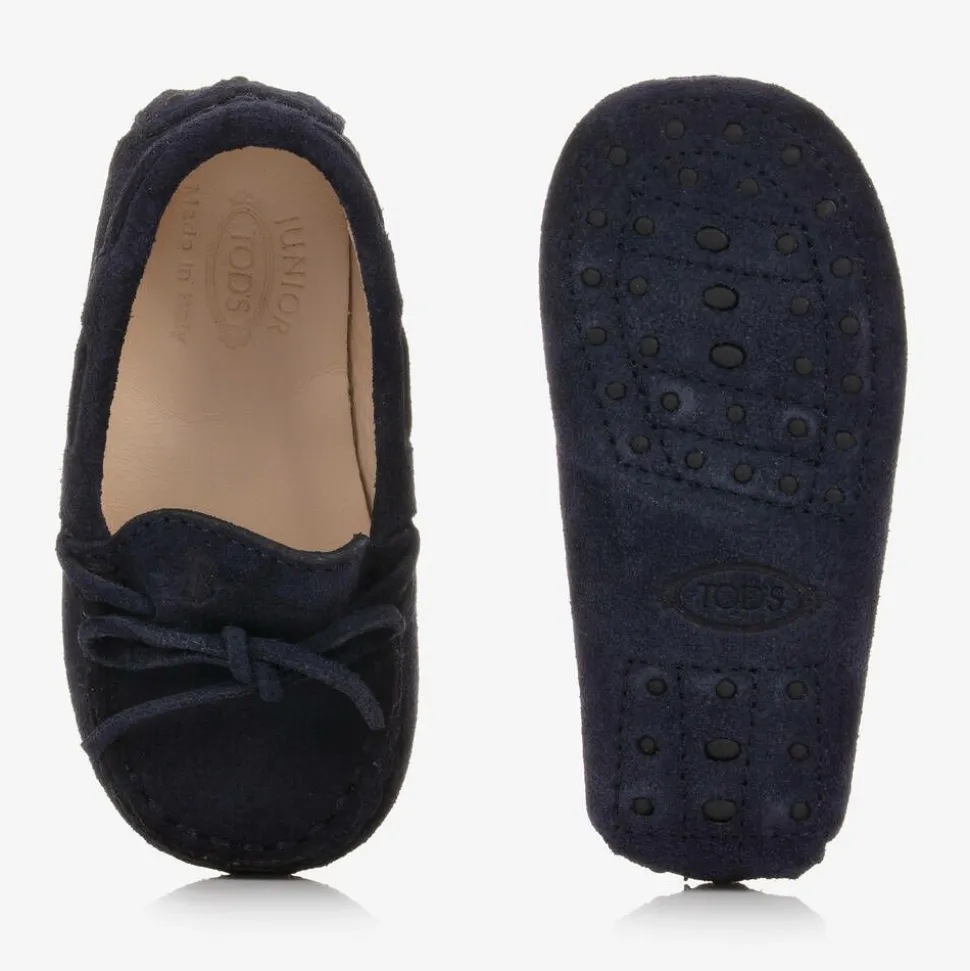 Navy blue pre-walker Gommino moccasins for baby boys and girls by luxury brand, Tod's. Expertly handmade in soft suede leather, this classic timeless style has a sweet bow on the rounded stitched toe, with pebble grips on the outer sole. The lining and insole are in smooth leather, providing stylish comfort for tiny little feet.
