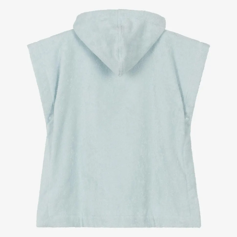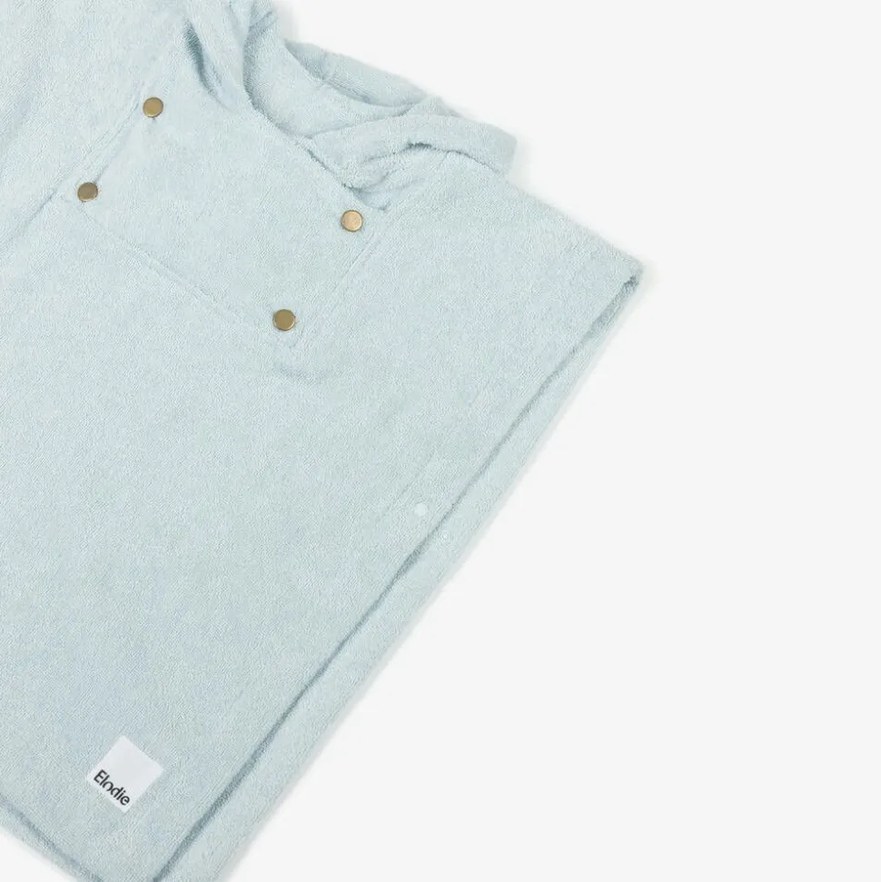 Pale blue hooded poncho towel for little boys and girls by Swedish brand Elodie, made in soft, absorbent cotton terry for super quick drying after a bath or a swim. Mid-weight, it has decorative, brass-coloured buttons on the front and popper fastenings on the sides, which allow movement yet keeps the poncho in place.