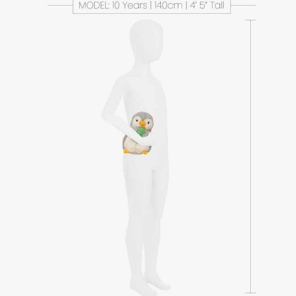 Adorable grey and white PomPom Penguin soft toy for boys and girls by Aurora, holding a green Christmas tree. Part of the brand's PomPom Penguins collection, it is handmade in beautifully soft plush and padded with recycled fibre and pellets. Spreading festive cheer, this cute and cuddly collectable has friendly beaded eyes and a sweet yellow nose and feet.
