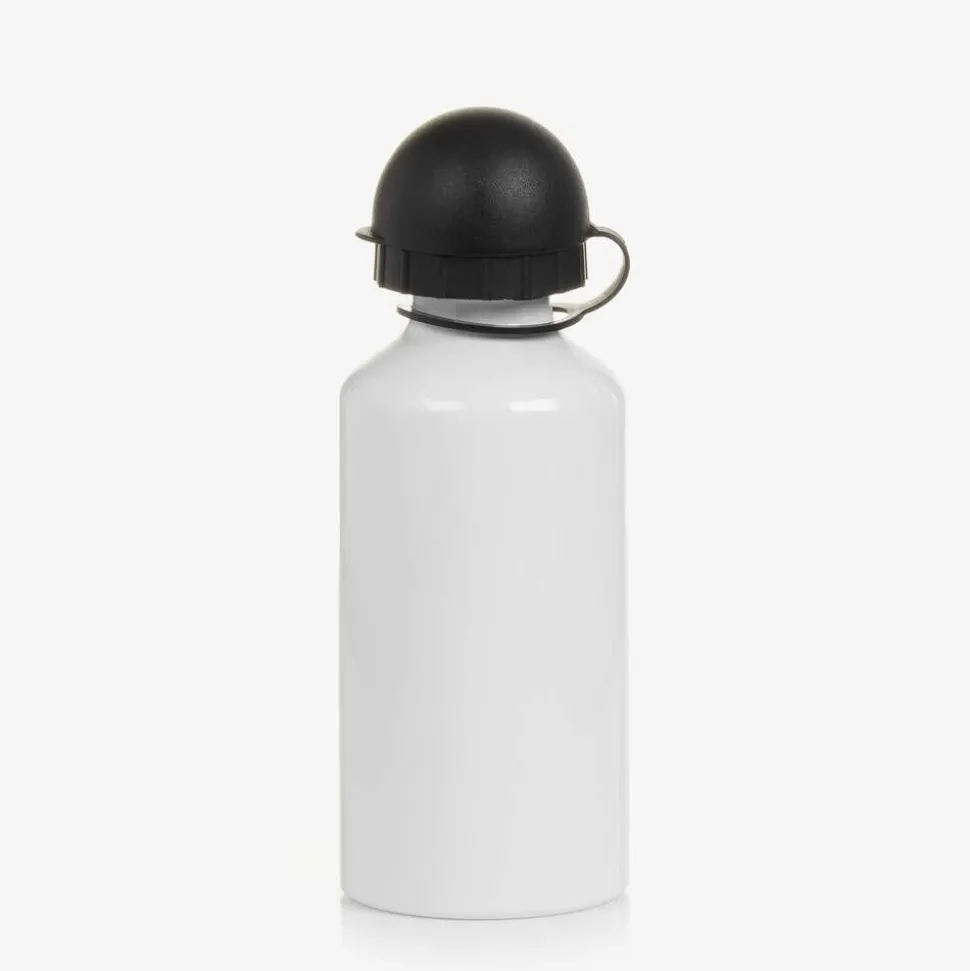 White 400ml water bottle for boys and girls, by Treat Republic. Made in strong aluminium, this school-essential is printed with a bold superhero striped star motif and your child's name for a personalised touch. It comes with two different types of lids. One has a useful sports cap, and the other has a screw-top lid with a clip and keyring to attach to their backpacks.