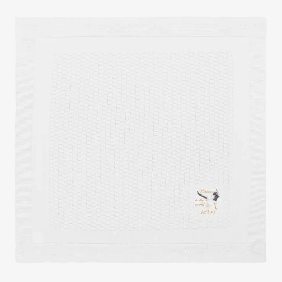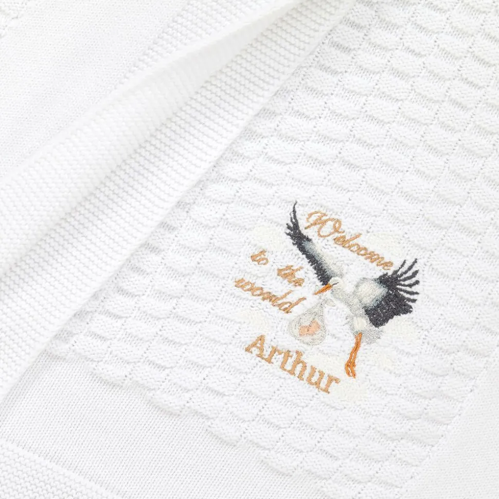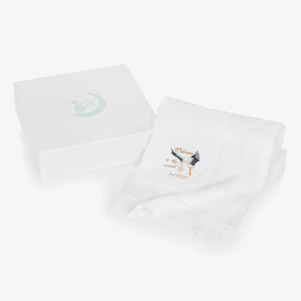 Personalised white blanket for baby boys and girls by Paint My Dreams, designed in the British countryside. Knitted in soft, lightweight cotton, it has delicate 'Welcome to the World' embroidery on one corner, with an adorable stork and your little one's name. Ideal as a thoughtful gift for a special new arrival, this nursery accessory comes beautifully presented in a gift box.